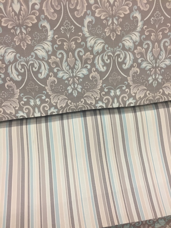 Я всегда рекомендую, выбирая предметы мебели и т.п., смотреть на на то, как это выглядит в каталоге. Если Вы посмотрите на фото с кроватью, то увидите. что обои за ней монохромные. И у Вас есть такой вариант. Поэтому берите смело его. Спинка кровати стеганая и этим уже создает узор. Можно, конечно, не полениться и примерить варианты с цветами и полосками в Фотошопе...))