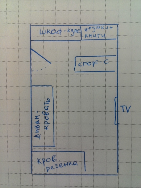 на скорую руку нарисовала сестре на салфетке). Диван аккордеон. С другой стороны от стенки ТВ будет оклеено обоями