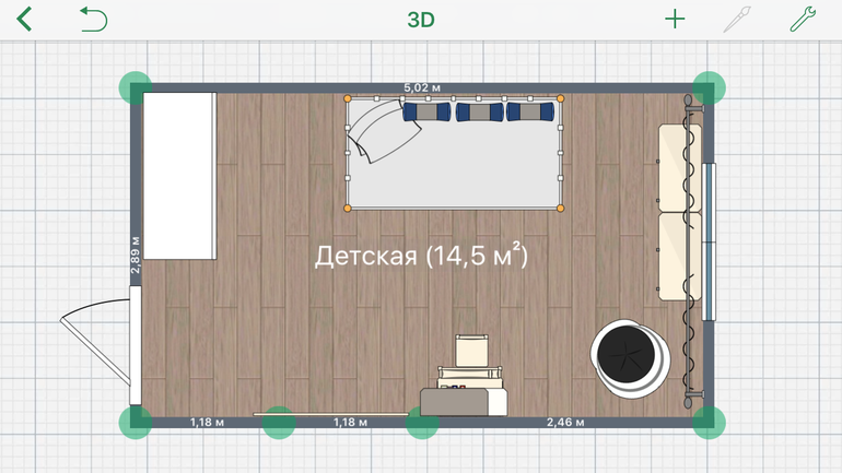 Уже завтра ждём прораба для оценки масштабов бедствия, поэтому я попыталась набросать примерную расстановку основной мебели (ее у нас пока нет), чтобы обозначить розетки. Вот что получилось с учётом того, что необходимо разместить большой шкаф-купе (детские шкафчики не рассматриваю), односпальную кровать, столик и стул для занятий (единственное, что у нас есть), место для хранения книг и игрушек, креслице для чтения (моя наивная фантазия).