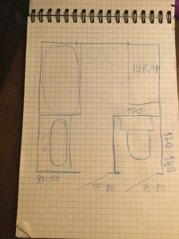 Планировка ванны/туалета. Всю сантехнику (туалет, ванна, раковина) надо разместить по стене смежной с кладовкой и коридором, тк остальные стены бревно (и мы его так и хотим оставить) - остаётся только шкаф)))