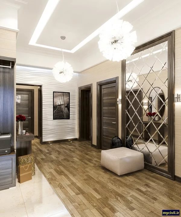 В коридор,слева от входа прекрасно бы поместилось пианино,а в простенок между двумя дверьми(гостиная и спальня) можно или консоль поставить или зеркало во весь рост повесить