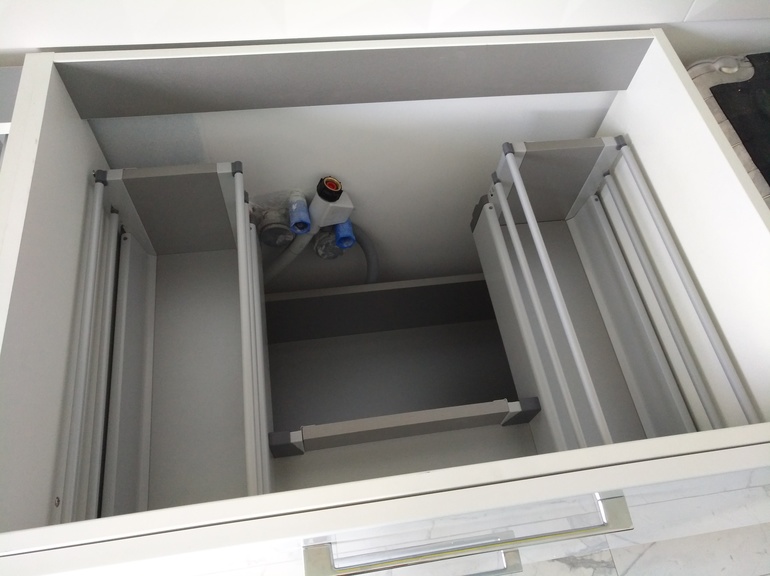 А тандем под мойку рассчитан был на 90 ширину тумбы, скорее всего. Поэтому нужно или высоту уменьшать или ширину боковых пеналов.