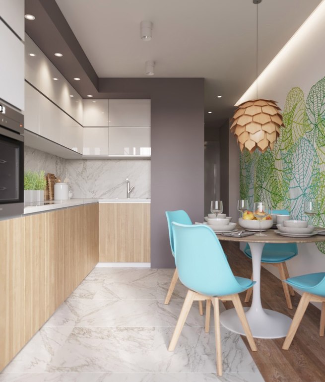 я счас дополню пост! забыла с казать, что будет очень активная стена , противоположная кухонному гарнитуру, где будет стоять стол со стульями..