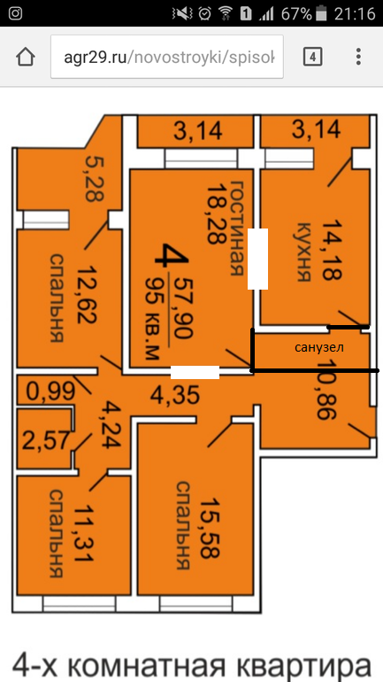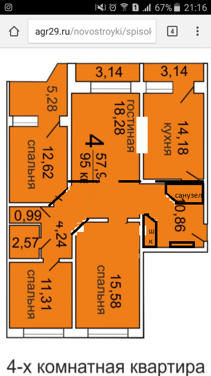 Итак, 4-комнатная квартира, общая площадь 95 кв.м. на семью из 5 человек - мама, папа, дочь 8 лет, два сына: почти 2 года одному и 2 месяца второму пупсику). Кухня, зал, спальня родителей (с лоджией), детская девочки и детская для парней. Квартира сдаётся с так называемой предчистовой отделкой: полы гвл, потолок покрашен, стены поклеены обоями под покраску, розетки/выключатели/радиаторы установлены. От плитки в ванной и туалете на полу и краски на стенах отказались, т.к. решили сразу укладывать свою плитку. Не будет от застройщика межкомнатных дверей, да и входная откровенно бумажная. План пока такой, без точных замеров (на этом плане отсутствует короб на кухне, а он там есть и приличный):