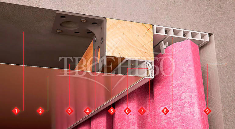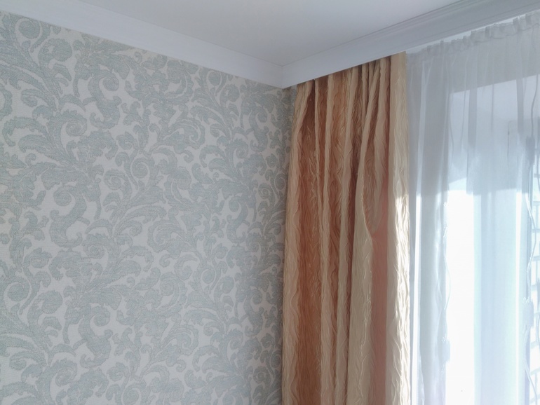 фото из интернета, но у меня точно так же выглядит, потолок у меня натяжной. Шина вы имеете ввиду карниз для штор? Карниз прикреплен к натяжному потолку к закладной (деревянный брус под потолком). А если вы имеете ввиду плинтус, то плинтус приклеен к стене и к декоративной вставке шины. Плинтус у нас широкий 7,5см плоский.