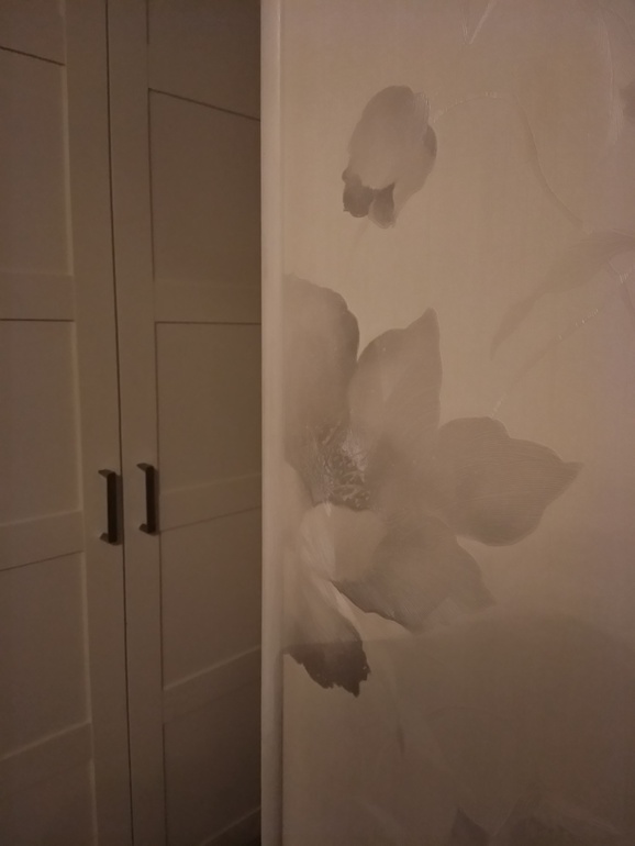 1) Поклеить от внутреннего угла такими обоями с рисунком (изначально там думала сделать однотон). Но справа и слева разная ширина этих выступов (6 см по левой стене и 20 см около батареи по правой стене), и я вообще не хотела их как-то выделять, совсем наоборот.