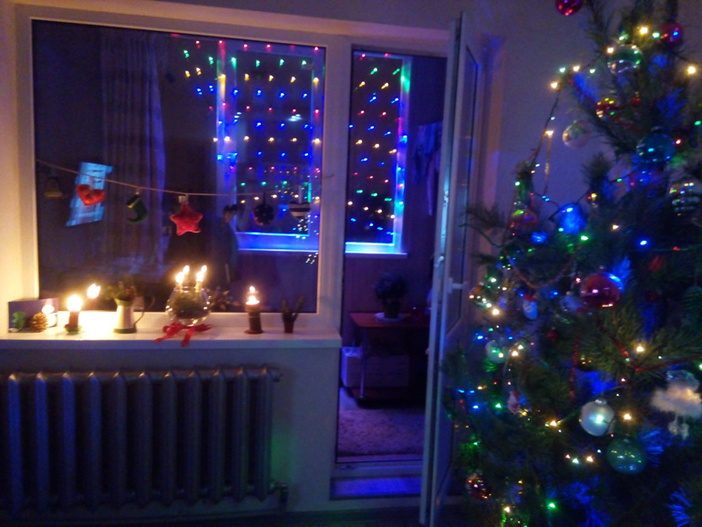 Слева от окна вход в кухню и раздвижная дверь. Справа, на месте ёлки, сейчас детская кроватка и в самом углу чётко за балконной дверью стоит маленький комодик.