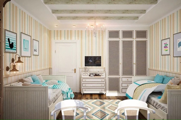 Интерьерное решение детской комнатыКомната 5,60 на 3,40 для двух девочек 5и 9 лет. Как лучше расставить мебель? Первый вариант