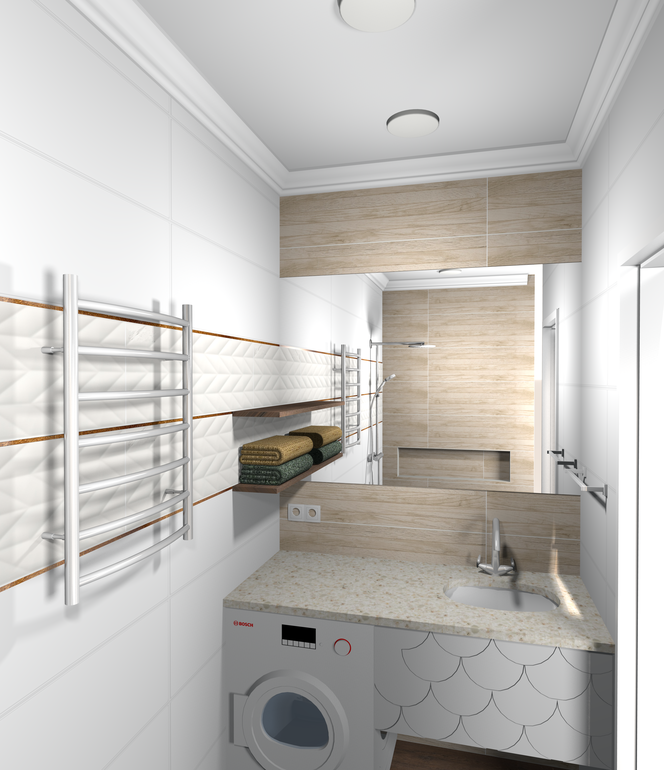 Я сделала ванну в таком цвете,только плитка другая. Сейчас смотрю и думаю не делала бы. Белая плитка очень маркая,особенно видны полоски от конденсата. Плитка под дерево тоже любит ловить влагу причем очень специфически. Вывод такой ,когда была плитка беж/ шоколад я спала спокойно,а белую только и тру и тереть ее надо равномерно,на ней видны разводы.