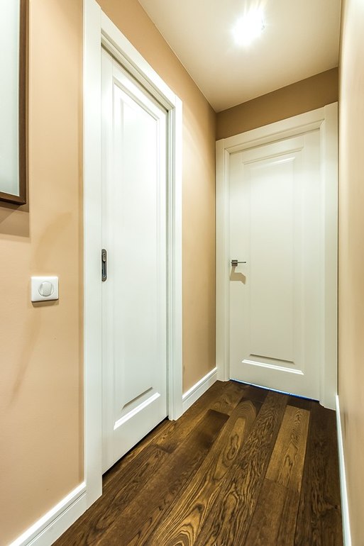 У нас коричневый пол хамелеон, от освещения меняется, то теплый, то холодный. Прекрасно сочетается с белыми дверями. Причем это довольно классическое сочетание, коричневый пол и белые двери.