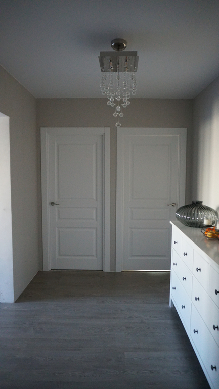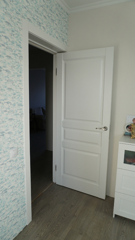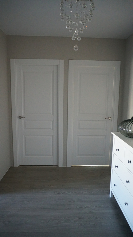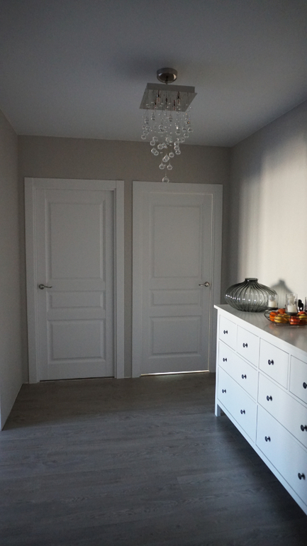 Двери в спальню и детскую модель S5. Не обращаем внимание на щели внизу, там планку не установили для ламината, вернее ее сняли перед установкой двери. Слева вход в зал, там будут раздвижные двери в следующий заказ. А может просто обрамление сделаем, сами еще не решили.