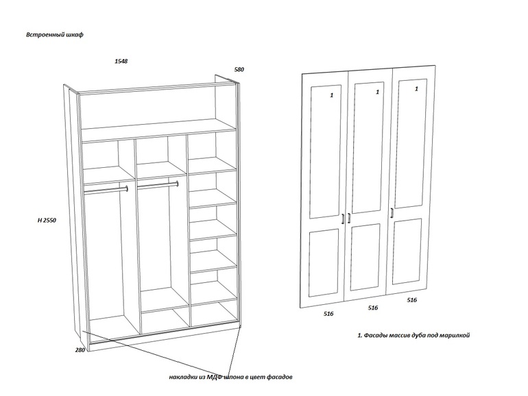 Если шкаф с белыми дверями, то не делай боковые накладки из шпона, масива. Массив закажи не дубовый, а попроще: бук, вишню, березу, чего там еще возможно.
