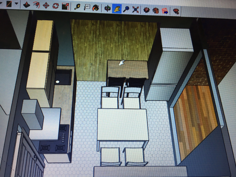 Правый прямоугольник: шкафы под потолок, в них холодильник, духовка, мироволновка, ПММ и т.д.