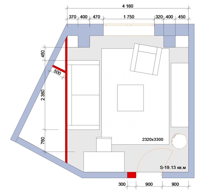 (Прочитала про гардеробную. Так 760 это же не размер двери)) это размер от дивана до стола, верно?) вполне логично, что дверь будет из спальни, по правую сторону от полок.)