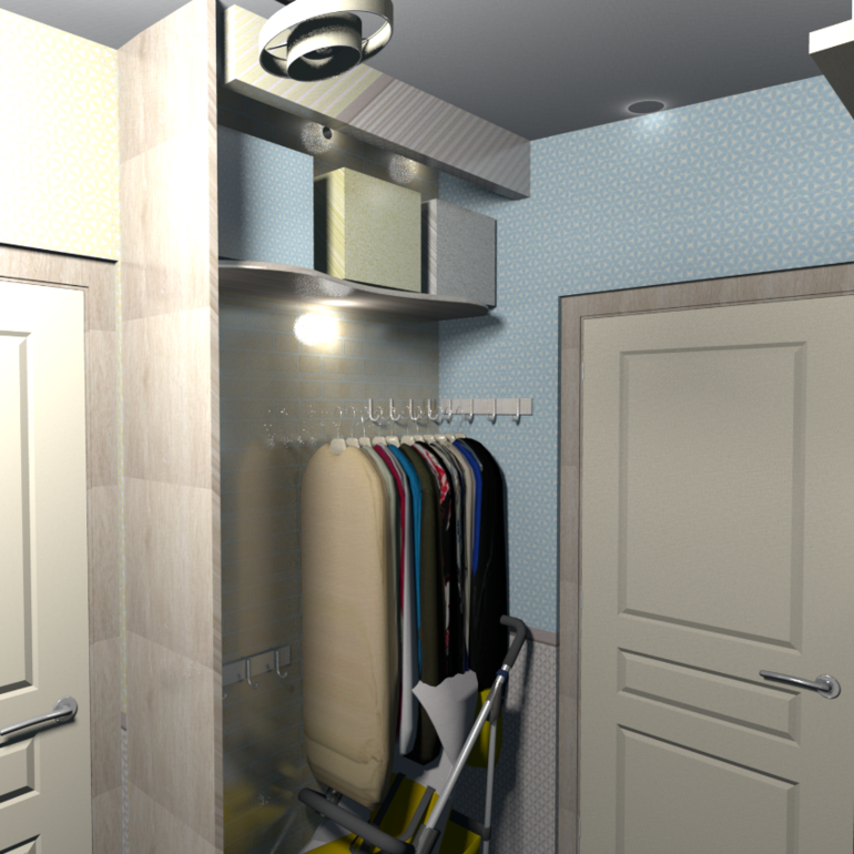 Верх будет "надстраиваться" до потолка. Опять-таки, каким цветом? Как весь шкаф? Или у меня мысль пустить по верху коридора такую декоративную вставку из "ромбовых" обоев..