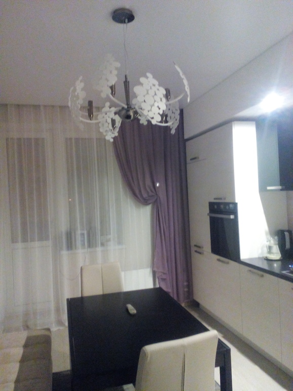 Люстра классная, но мне кажется тоже, неподходит сюда. И штору чуть поправить. А так, все очень у вас на кухне красиво и со вкусом.