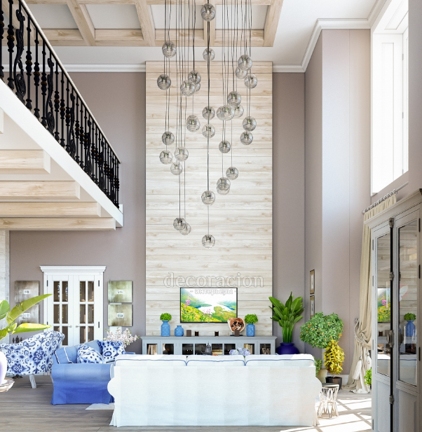 только потолок будет скошенный и обшит белой вагонкой+балки, и у дверей не будет таких косяков. Из-за потолка крепить люстру с большим основанием не удобно, решили что нужна на крюке и спустить по цепочке ниже уровня второго этажа, т.е. такие люстры как на фото с интерьером не подходят.