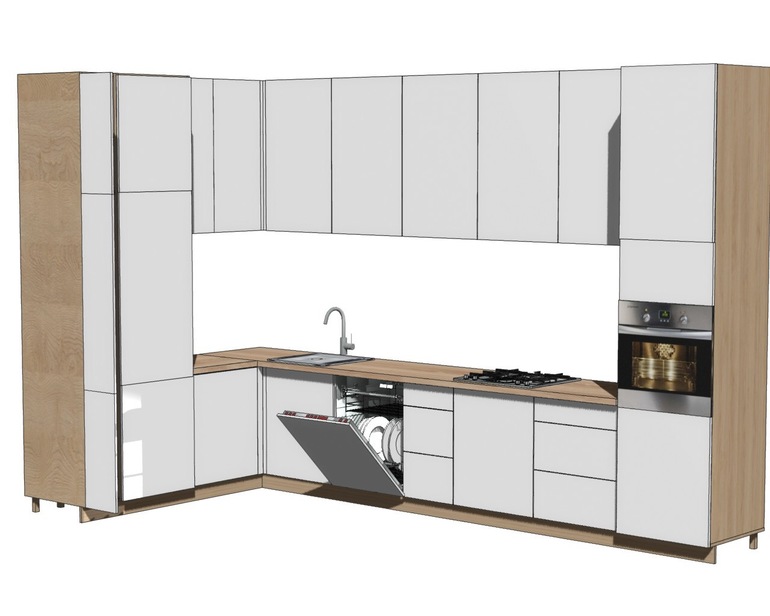 Единственное, соединила бы ящик под варочной и рядом справа который. Туда слона можно было бы впихнуть. А мелкую технику в ящик возле холодильника (слева от мойки). Разделила бы на два и сделала выкатными и продумала резетку, чтобы можно было подключить технику не доставая из ящика. Можно духовку опустить на один ящик и над ней встроить микроволновку.