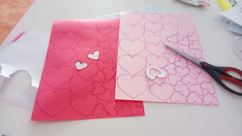 Сделали 3 шаблона сердца разных размеров, обвели с учетом того, что каждые два обриса составят одно сердечко на нитке: