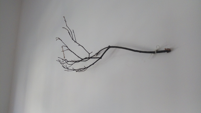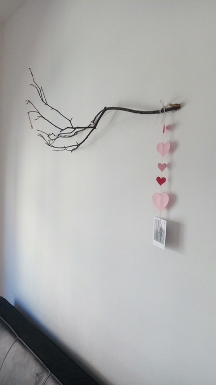 На стене над диваном у нас 2 гвоздя от картины, на них мы и привязали ветку: