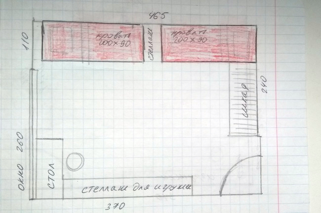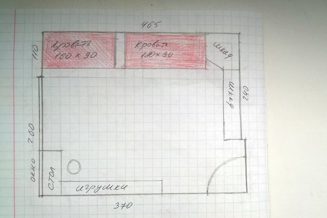 Нет, я не стала рисовать. Померили просто, что по одной стене как раз две кровати 90/200 и шкаф 90 влезет, так и купили. По стене напротив ТВ. Хочу потом еще комод под ТВ и стол с полками для книг. Но еще не подобрала. Те, что идут в одной коллекции с кроватями и шкафом, мне не нравятся. Расположение окна и двери в детских у нас с Вами, кстати, одинаковые. У нас только комната немного побольше (17 кв.м.)