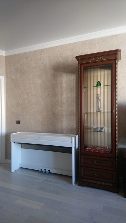 Белую и отделила бы визуально зону с фоно и остальную мебель. Хоть 10 см между ними промежуток и над фоно как-то стену украсить.