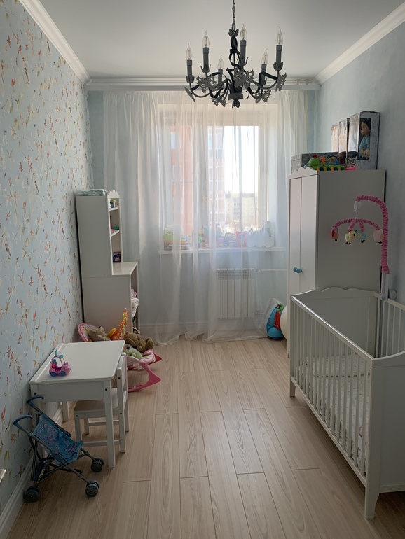 Зачем в детскую вешать шторы? Как по мне, достаточно нежного белого тюля. Комната светлая и просторная, а если повесить штору, будет мрачновато. А если вам необходимо закрывать окно от уличного света, то можно купить рулонные шторы и лучше если они будут светлых тонов. Вот тут можно приобрести такие шторы на заказ у нас в Москве.