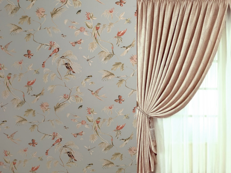 Я бы оставила так, а чтоб затемнять для сна то рулонные шторы на само окно. Мне кажется стена с окном узкая и со шторами будет нагромождение. Если принципиально шторы хотите то лёгкие, нежные, молочного цвета, либо в тон птичек на обоях светло-персиковые