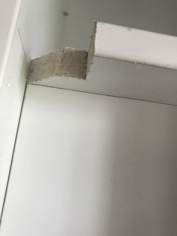 Меня конечно не устраивает такая картинка. И вот думаю, а не заставить ли их переделать нормально? Только что для этого нужно? Просто заменить полку? Насколько этот процесс "глобален"? Придется ли для этого снимать весь шкаф?