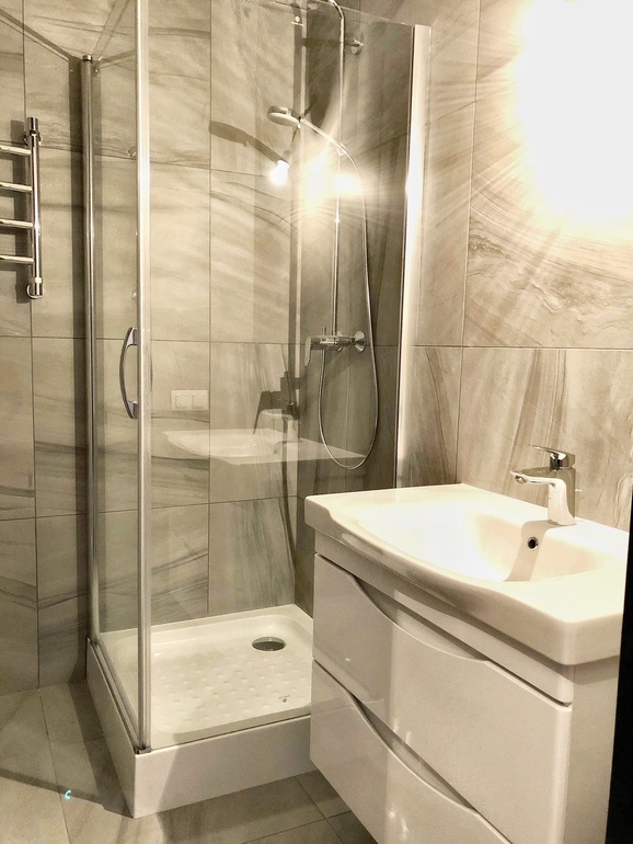 Апартаменты в ЖК Онли ребята купили готовые, то есть вся чистовая отделка, кухня и сантехника стояли на месте. Моя задача состояла в том, чтобы подобрать освещение, мебель, шторы и самое главное сделать демонтаж старого поддона в санузле заменив его на новый, но большего размера. При этом остальная плитка должна быть сохранена.