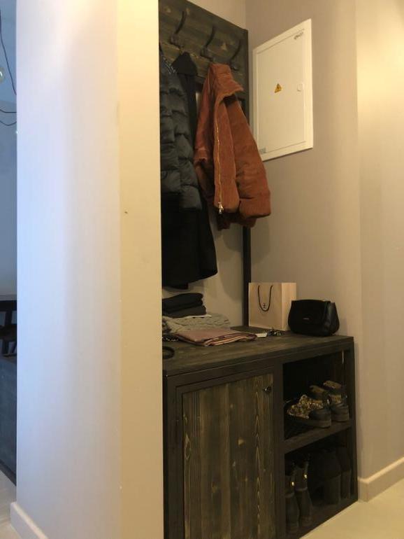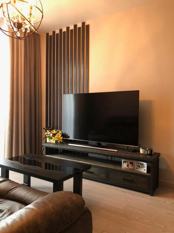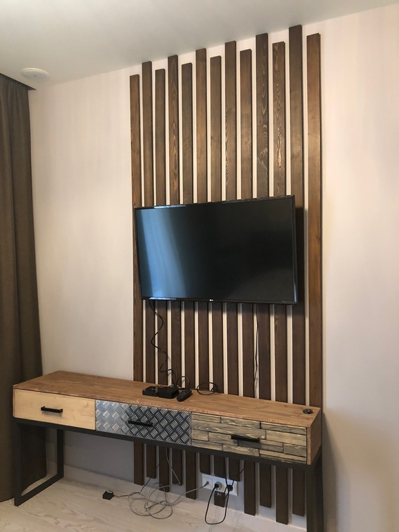 Но зато получились отличные тумбы под телевизоры и подстолья с раковинами. Аксессуары черного цвета - загляденье. Шторы блэкаут выполнены идеально.Вся мебель сделана на заказ по моим эскизам за исключением дивана, стола и стульев:)