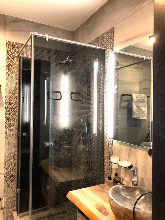 мозаика, поддон из нее + ограждение + мебель с зеркалом+аксессуары+свет