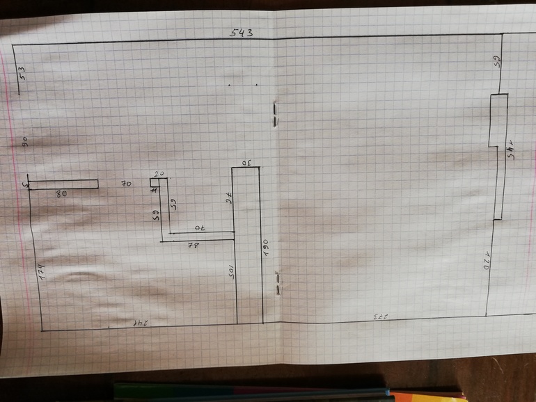 Я думаю, что в так называемом коридоре поставить один единственный шкаф. По стене 190 сделать кухню. Спальное место - диван поставить у стены 543, по одной линии со шкафом, напротив телек и какой-нибудь небольшой столик. В коридоре есть еще закуток, по ширине туда поместится холодильник, правда неудобно. Хотя, в такой тесноте вообще не может быть удобно. Больше ничего в голову не приходит. Может я просто не вижу каких-то простых, но функциональных идей?