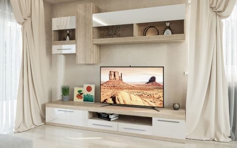 ТВ может стоять на комоде или сразу на двух. Они хотябы по хранению удобные, вместительные. По высоте тоже комфортно, нет ощущения задранной головы, все на уровне глаз. А выбранный набор шкафчиков совсем не функциональный.