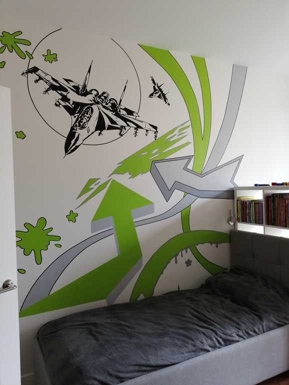 Интерьерное решение детской комнатыПишу для информации, тк в свое время достаточно долго искала художника. Довольны и результатом, и сроками и адекватной ценой. Комната для двух мальчиков, один фанат футбола, второй любит технику и оружие. Контакты в личку, если надо)