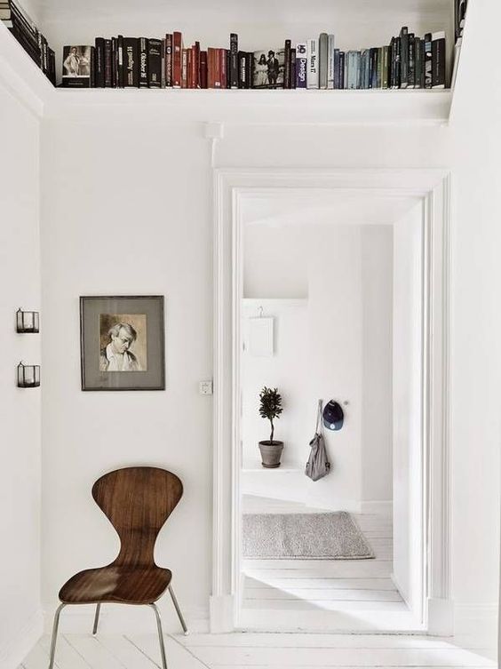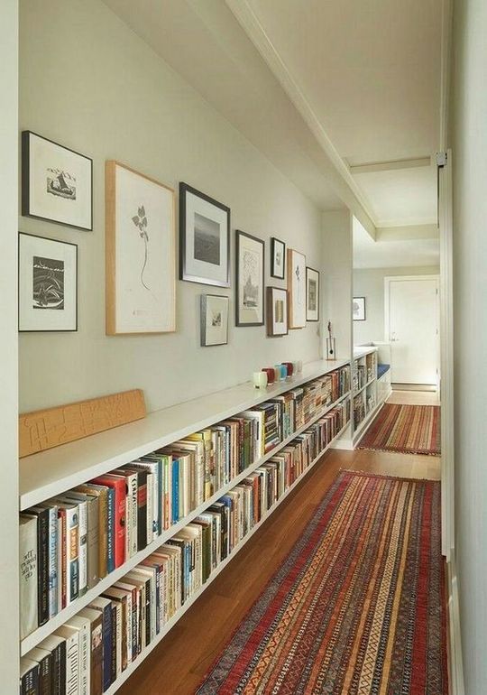 -Если в квартире имеется длинный коридор, можно разместить книжные полки на одной из стен.