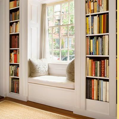 -В спальне можно установить высокие стеллажи по обе стороны от окна. А между ними соорудить скамью, на которой можно уютно разместиться за прочтением книги.