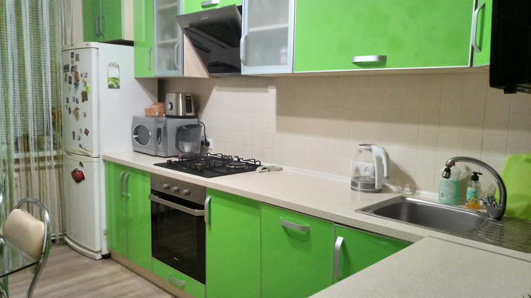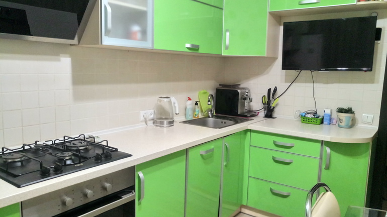 Вроде и столешница почти пустая, а ощущения спокойствия нет. Мне кажется самого цвета в кухне много, очень активный зеленый цвет. Именно по этому так и бросаются в глаза всякие мелочи.