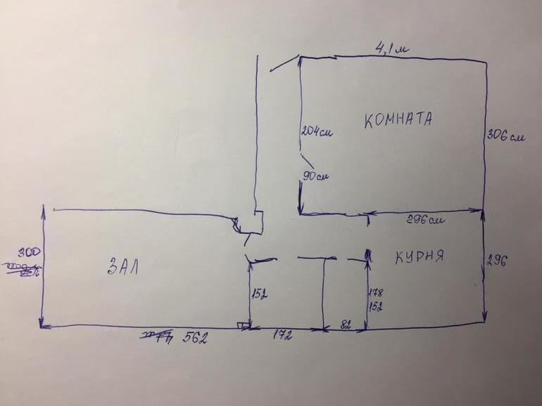 Делали с похожей планировкой в прошлом году бабушке. Соединили кухню с комнатой, есть раздвижная дверь, чтобы при жарке рыбки (любимое блюдо у всей семьи в исполнении бабушки) не было сильного запаха в комнате. Есть маленький столик ИКЕА, который прикручен к стене и складывается , когда бабушка кушает одна. Для гостей стоит большой раздвижной стол в комнате ближе к углу. В зале диван и тумба под телевизор ещё.