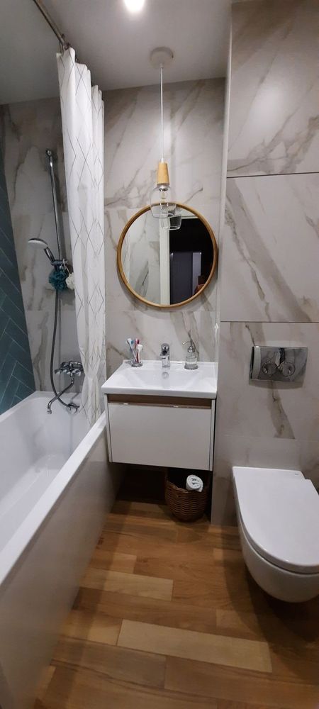 Расстроилась страшно, т.к. мне показалось, что с такой неоднородной акцентной стеной+мрамор+дерево получится просто винегрет какой-то!