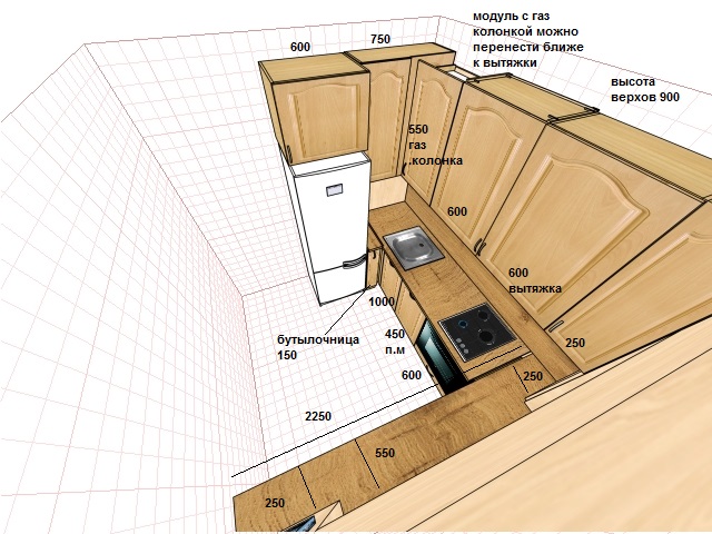 У нас такая же кухня. Слева рабочая поверхность, в углу мойка, внизу угловой шкаф, встроенная посудомойка, угловой шкаф под мусорное ведро, в центре 2-хконфорочная варочная панель, внизу встроенный духовой шкаф-микроволновка, в углу у окна холодильник, газовая труба за ним. У окна ящик для столовых приборов и посуды) подоконник тоже используется для готовки, в откосах розетки.