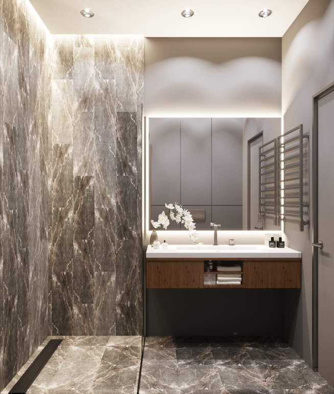 Для санузла я предложила заказчику 2 варианта с керамогранитом. Не определились, какой вариант лучше.