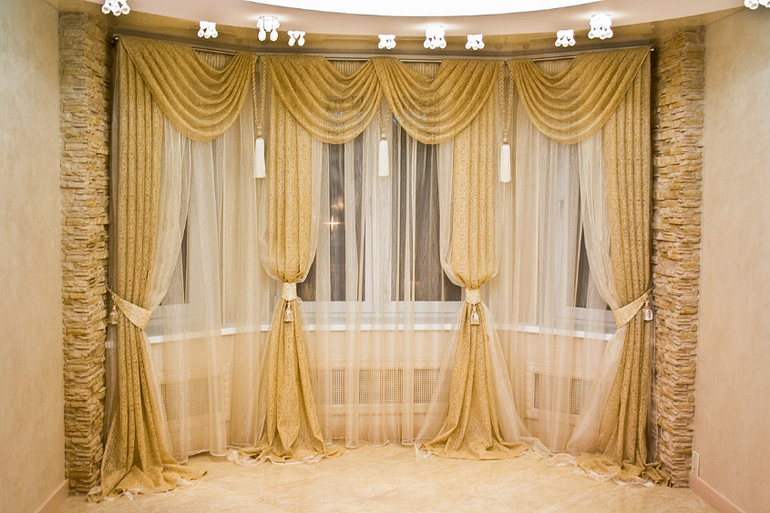 А хорошо ли "классика с ламбрекеном" будет сочетаться с деревянным потолком и стенами? Может что-то подобное попробовать: