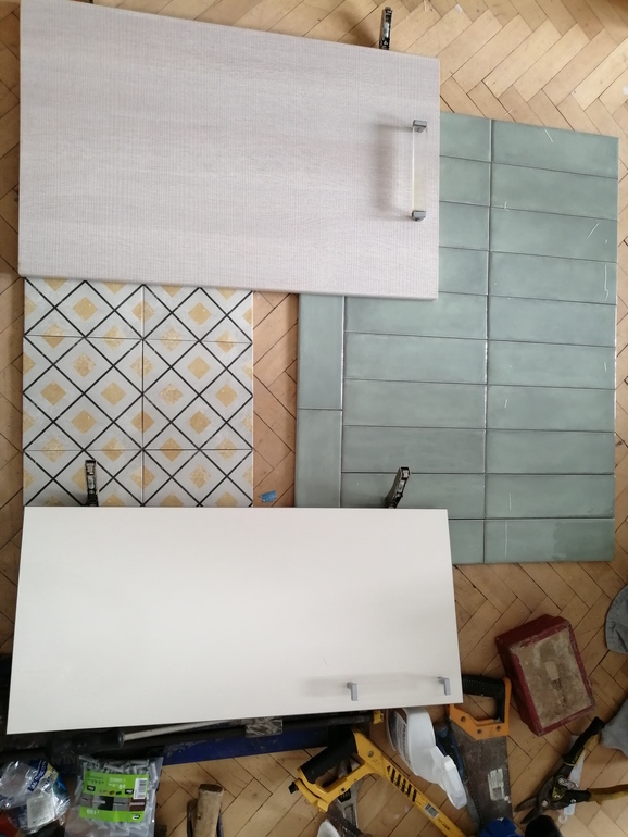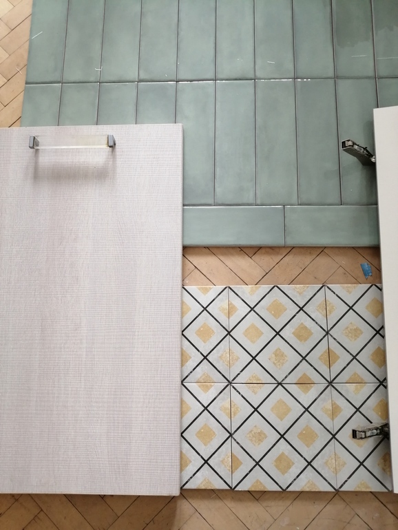 Я тоже сейчас делаю ремонт и хотела яркого сочного жёлтого.. сначала думали пол, но потом решили на фартук. Мне кажется, у вас офигенно пойдёт эта серо-зелёная на пол, очень благородно и необычно, а геометричность ярким акцентом выделить фартук:)