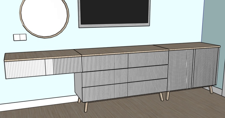 Интерьерное решение спальниПокажу вам еще один проект мебели. На этот раз это мебель в спальню: прикроватные тумбочки, консоль, ТВ тумба с выкатными ящиками и тумба с полками.