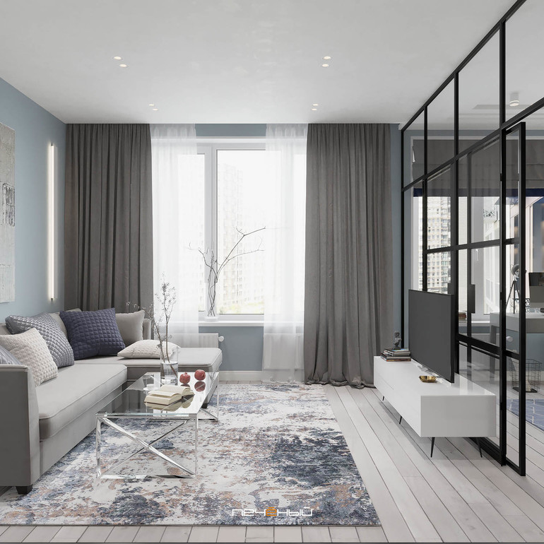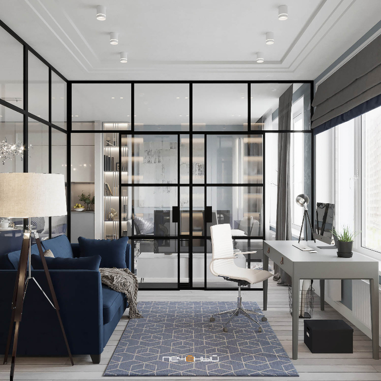 Полноценный кабинет - настоящая материализованная мечта тех, кто часто работает дома. Он отделён стеклянными перегородками, которые пропускают свет и создают иллюзию единого пространства. При этом изменяемая прозрачность позволит при необходимости уединиться и поработать, не отвлекаясь на тех, кто сидит в гостиной.