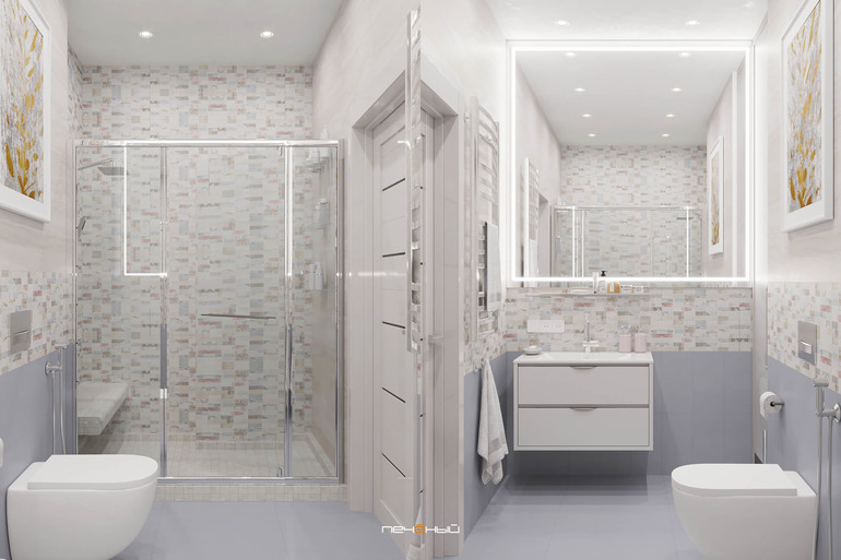 Этот санузел больше предыдущего - 5,5 кв. м, но здесь установили душевую кабину. Забавно, что в этой квартире именно санузлы стали камнем преткновения - с ними мы возились дольше всего. Никак не получалось прийти к общему соглашению, чтобы всё сошлось и всем понравилось и стилистика, и цветовая гамма, и бюджет. Но в итоге все трудности преодолели, пожелания учли: все остались довольны! :)