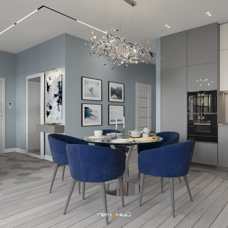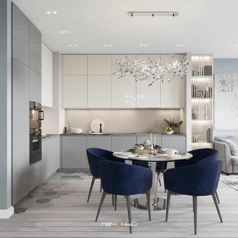 Чтобы кухня-гостиная не смотрелась «холодной», мы использовали уютный текстиль, деревянные полы и много различных сценариев освещения. Кстати, про пол: «палубная» доска визуально здорово расширяет пространство! Мы выбирали светлый серый тон под стать общей колористике.