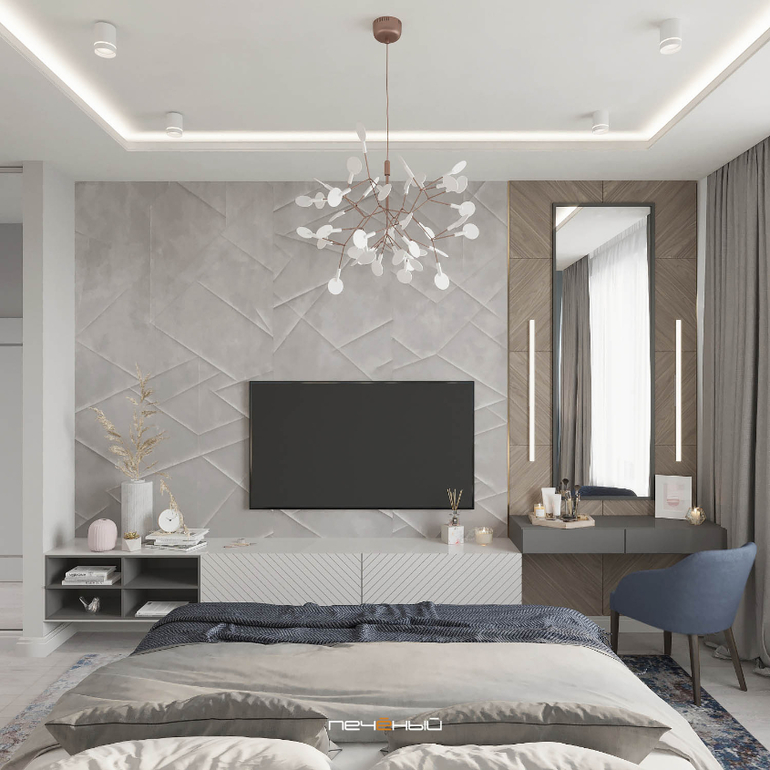 За самим телевизором наклеены обои-фреска - ручная работа, имитация ткани. Достаточно дорогое удовольствие, но оно того стоит! Качественная фреска способна преобразить любой интерьер. За туалетным столиком стена оформлена деревянными панелями. Получилось весьма оригинальное сочетание разных натуральных фактур.