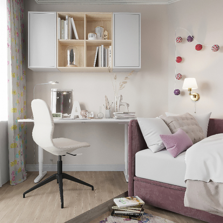 Вот и тот самый подиум, о котором я говорил выше. На нём возле окна расположилось рабочее место, а вдоль одной из стен - кровать. Стену напротив решили сделать акцентной: оклеили обоями с разноцветными колибри, поставили удобное стёганое кресло, столик с лампой-кроликом - получилась классная зона для чтения. :)